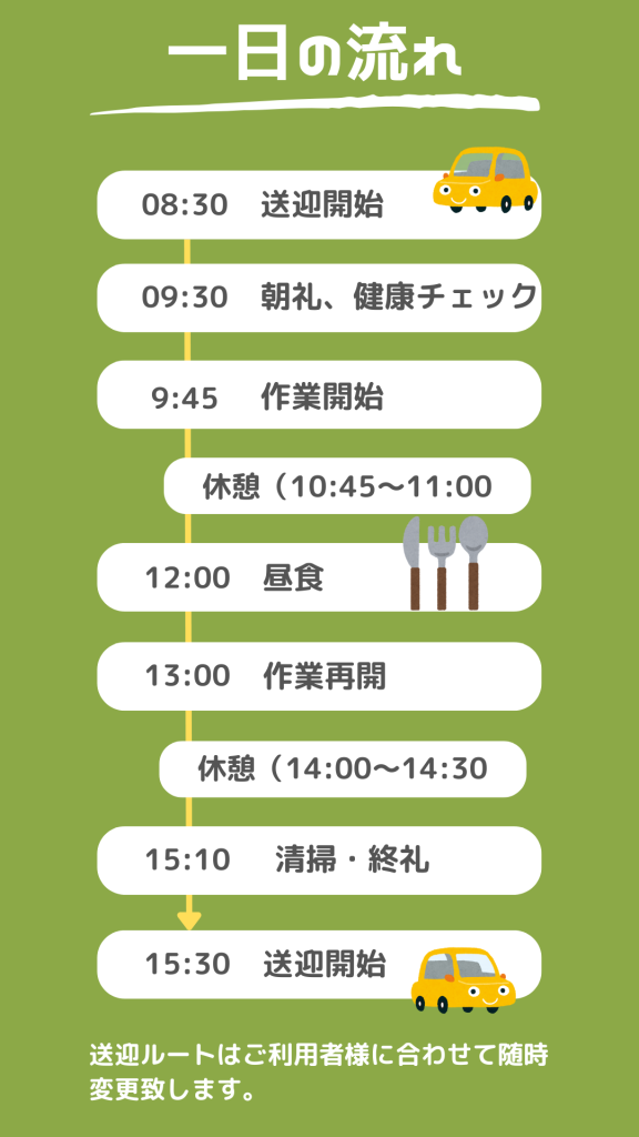 午後3時10分ごろには作業終了です。片付け、掃除をして、終礼後、送迎車でご自宅付近まで送迎致します。